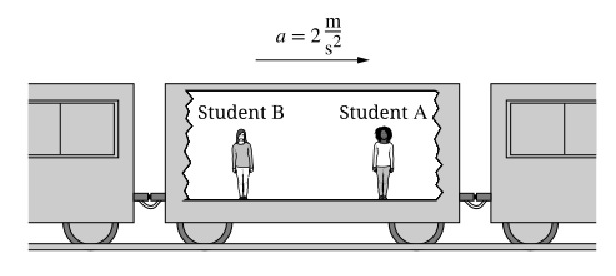 7. Students A and B are standing inside a train that is accelerating to the right with a magnitude of 2m/s2 . Student A throws a ball to the left toward Student B with a horizontal velocity of magnitude 4m/s relative to the train. At the instant the ball leaves Student A ’s hand, the speed of the train relative to the ground is 10m/s to the right. The ball takes 0.5 second to reach Student B. Immediately before the ball reaches Student B , the horizontal speed of the ball relative to the ground is
